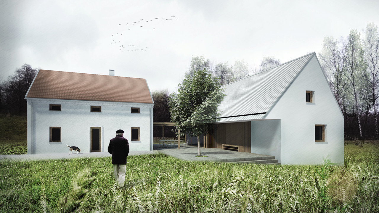 Nová výstavba, krček i rekonstruovaná část společně vytváří ve své výsledné podobě půdorysně objekt tvaru L. Jde o volnou inspiraci i odkaz na archetypální podobu venkovských usedlostí s jasně definovaným dvorem. Nový rodinný dům je navržen jako nízkoenergetický jednopodlažní s částečně využitelným podkrovím se sedlovou střechou. Jedná se o relativně malý prostor řešený na míru.